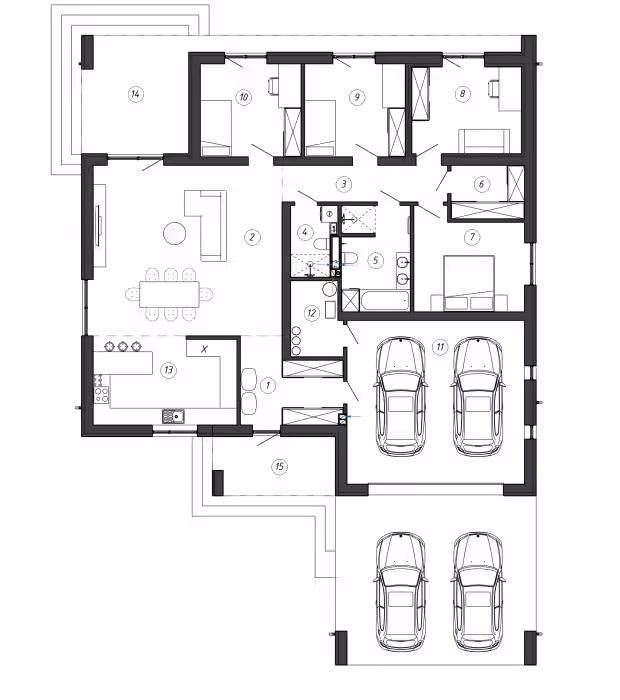 Минимальное количество коридоров позволило сэкономить полезную площадь и разместить просторную кухню-гостиную, а в жилой зоне три спальни и кабинет.