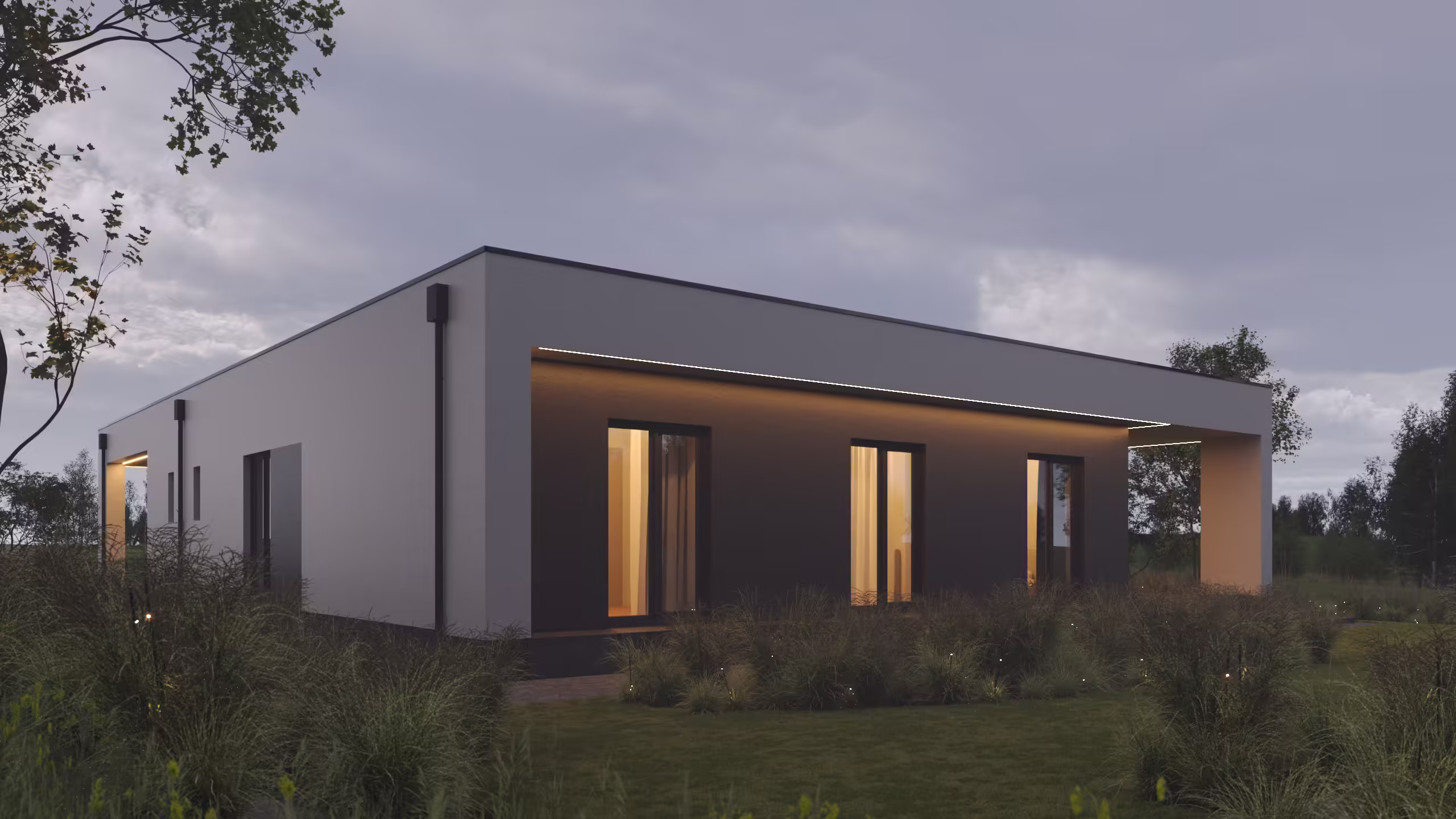 Минималистичный дом с гаражом и навесом для автомобилей. В планировке дома нет ничего лишнего все помещения размещены очень компактно но функционально.
