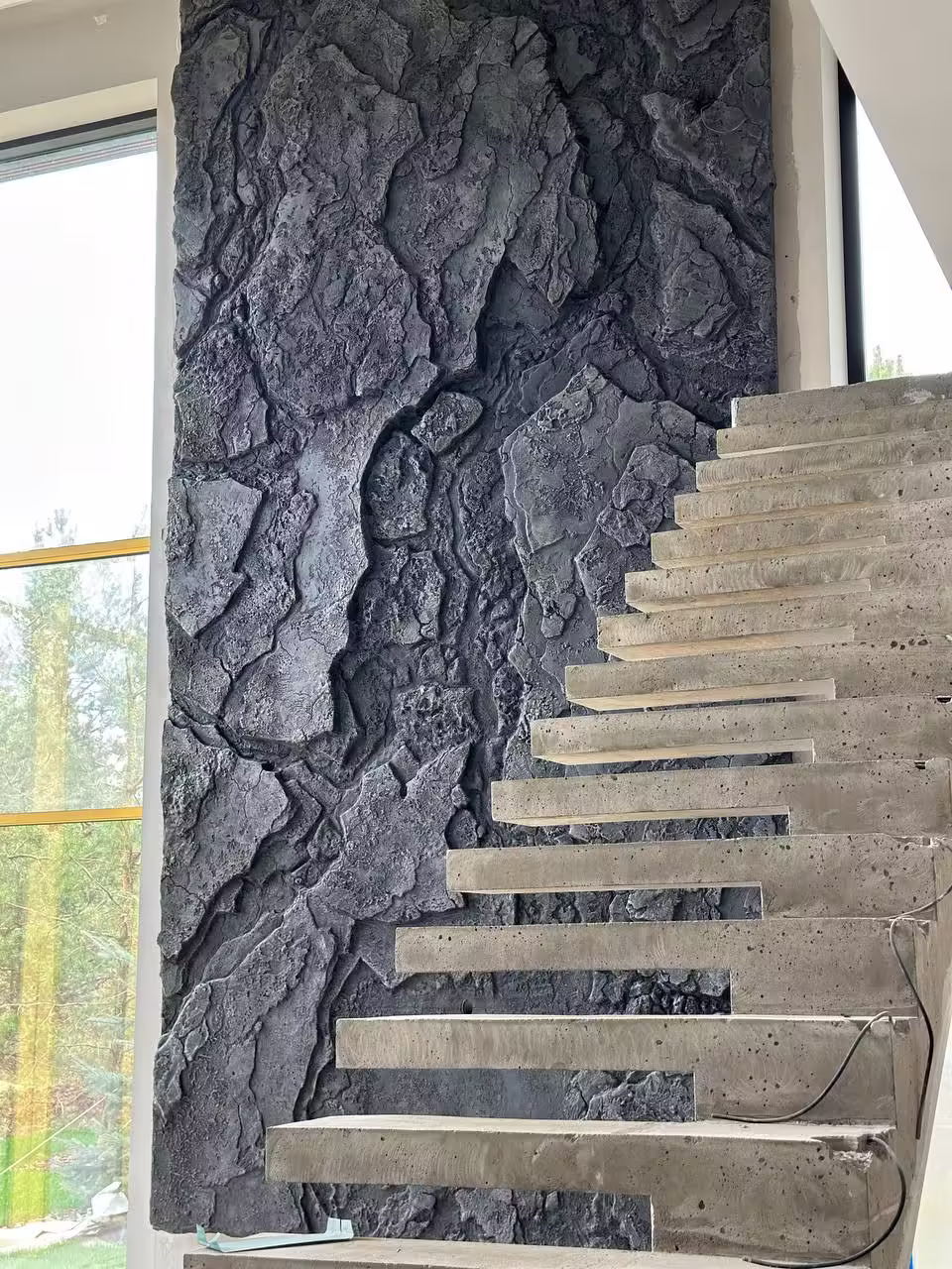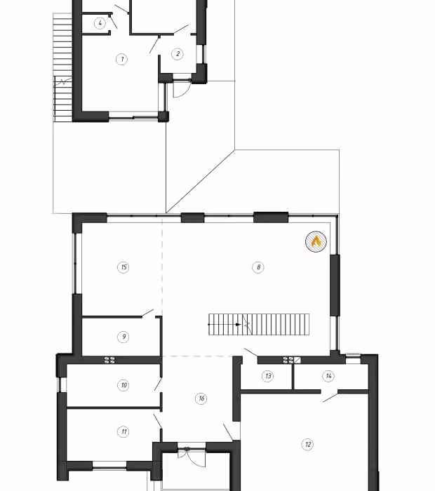 В планировке основную площадь занимает кухня-гостиная с открытой парящей лестницей, которая стала акцентом интерьера.