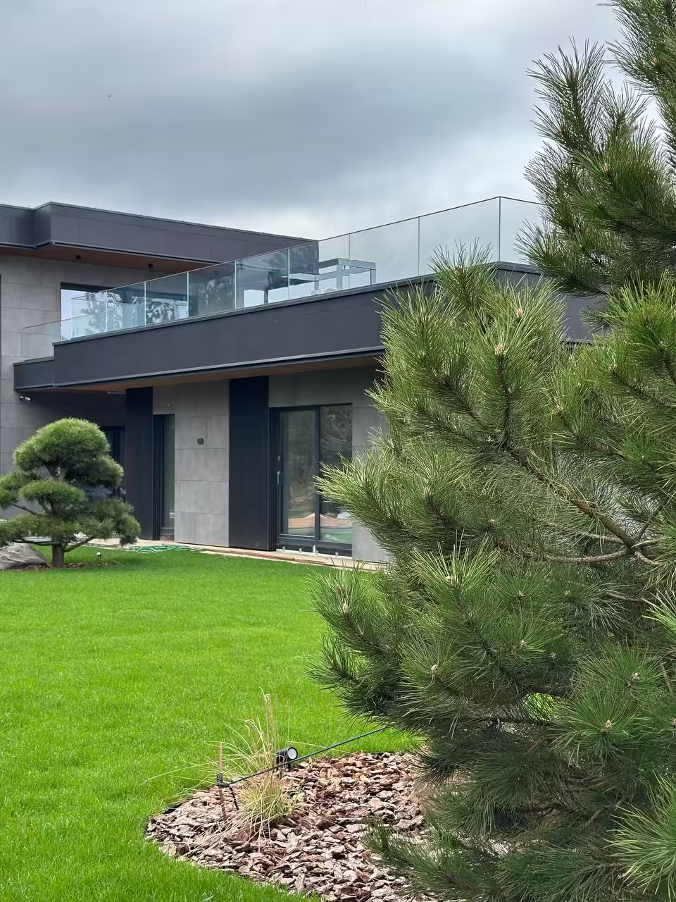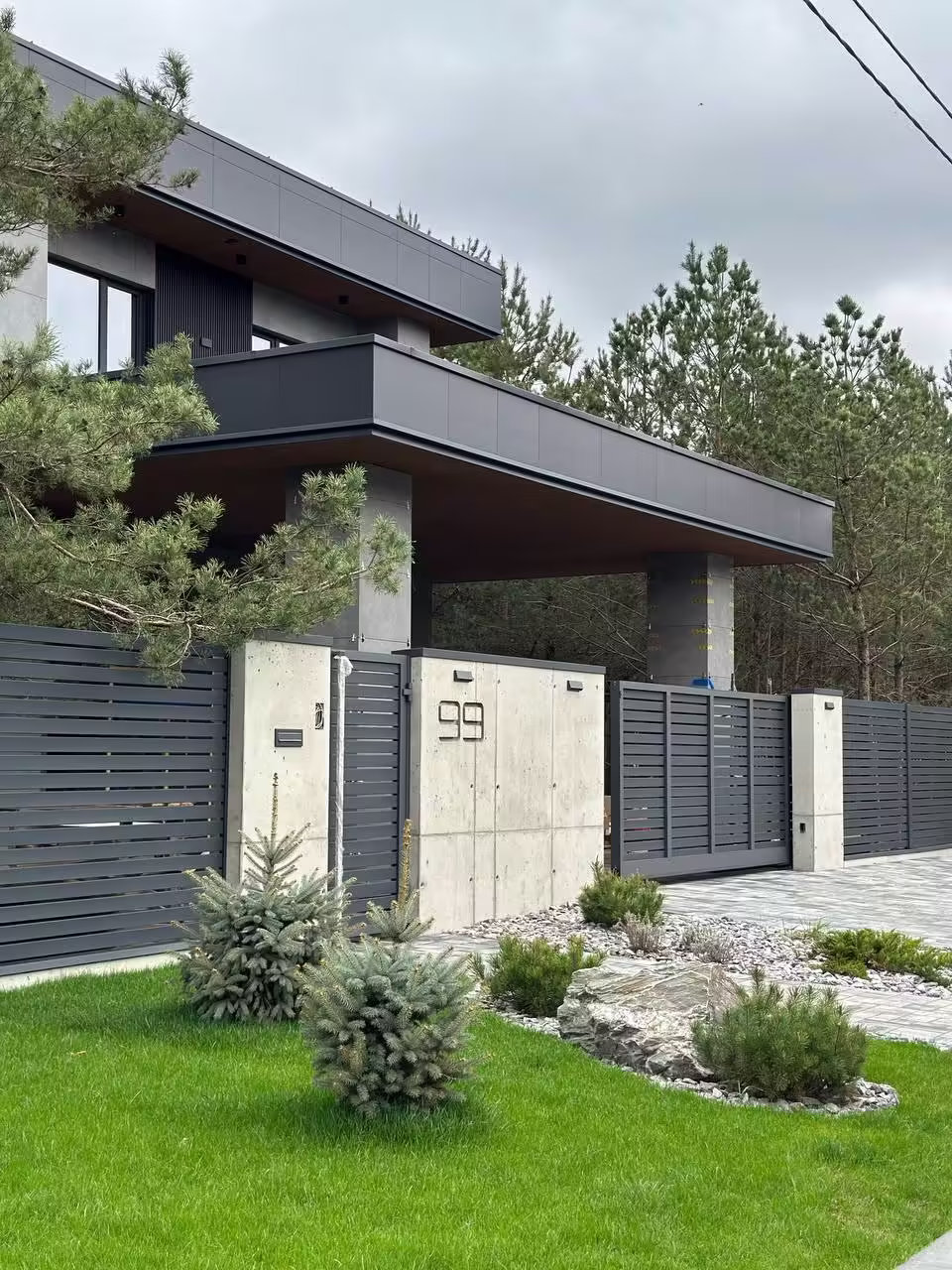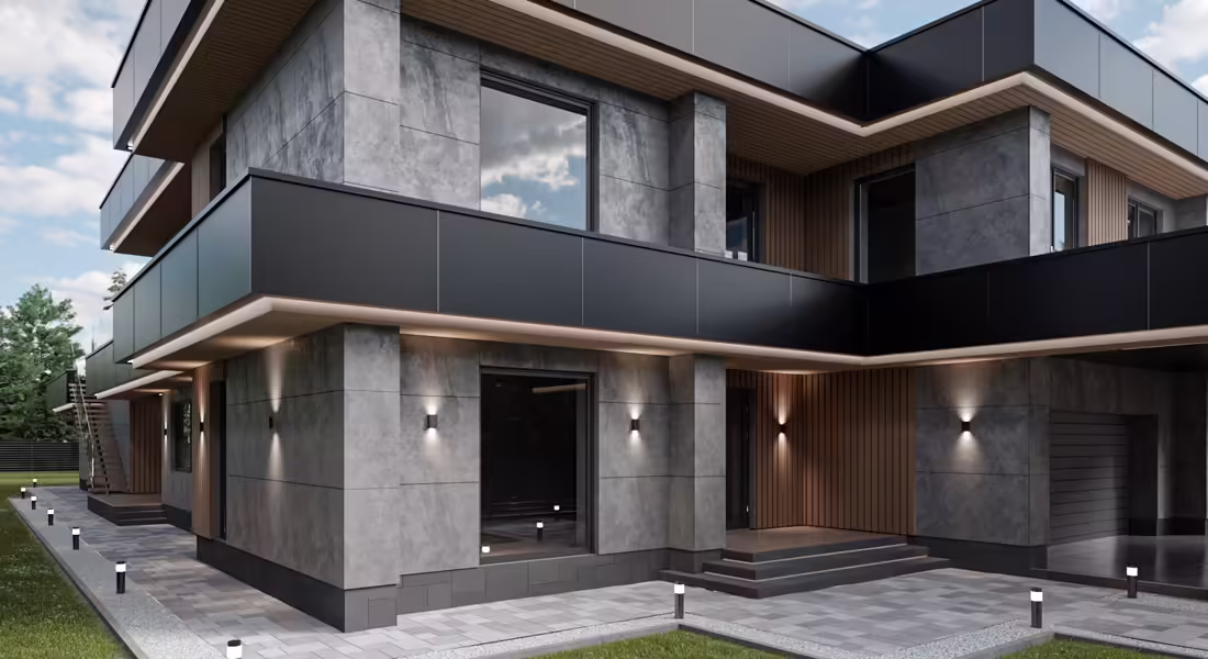 В отделке фасадов использован керамогранит и декоративные реечные панели из ДПК.