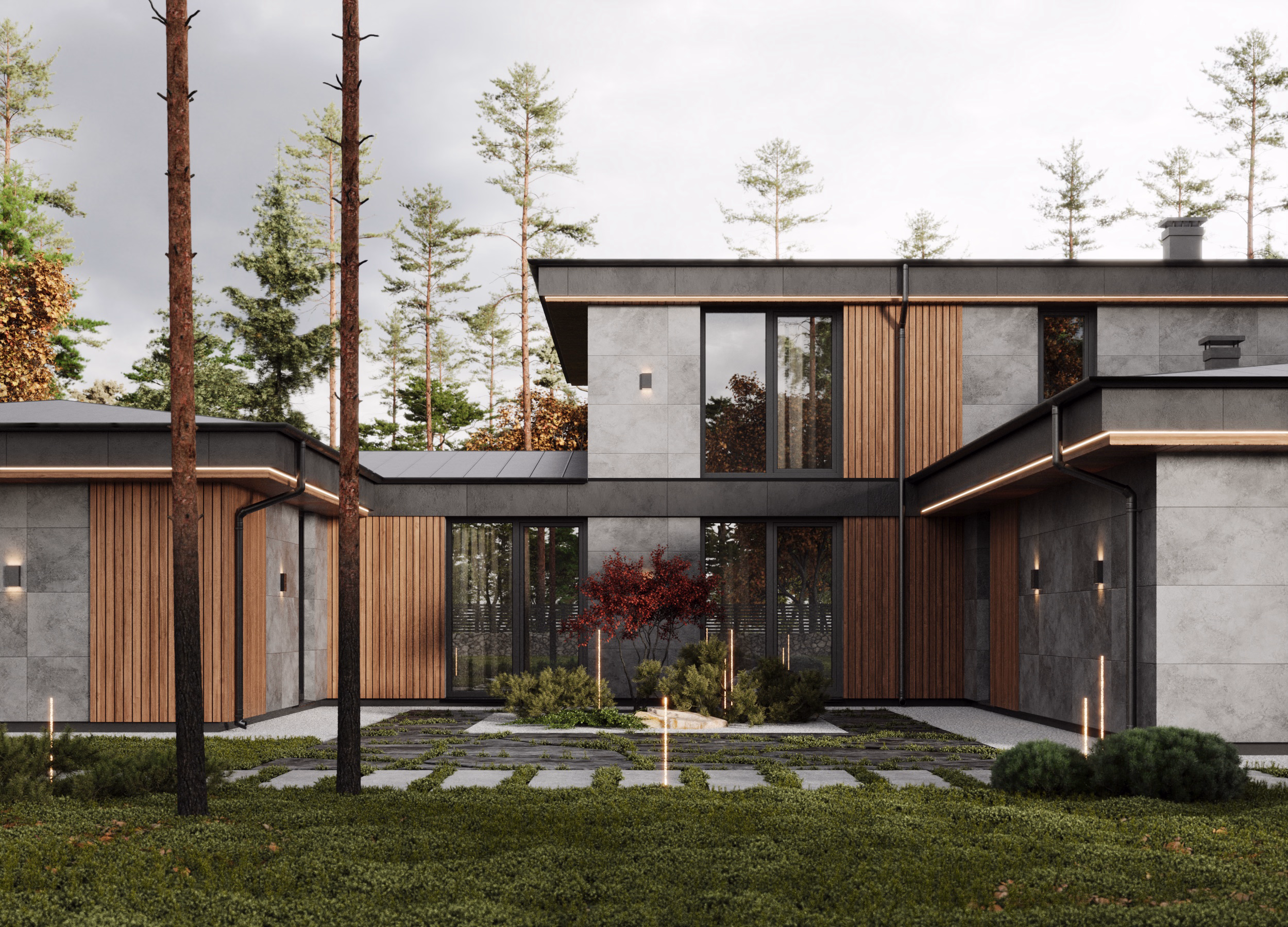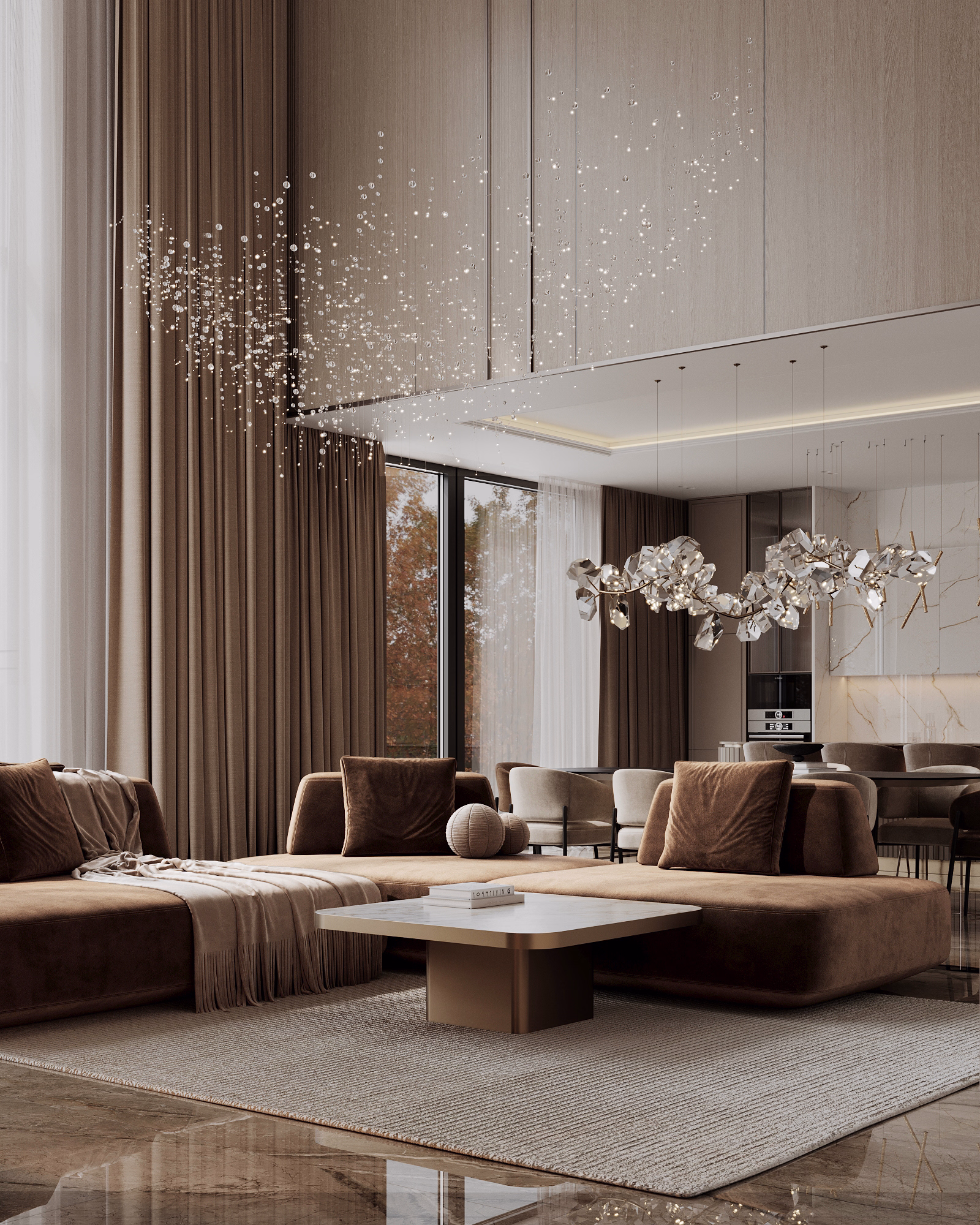 Этот проект воплощает современное пространство с утонченными деталями неоклассики, создавая элегантную и гармоничную атмосферу для комфортной жизни. Основная идея — сохранить стильное и изысканное пространство, в котором каждая деталь подчеркивает статус и качество. Особенность дома — сложное двухуровневое планирование, акцент на простор и свет, подчеркнутые просторной кухней с островом и стильной лестницей. В зоне гостиной расположены тв зона, каминная зона и современный модульный диван, что создает уютную и функциональную зону отдыха. В отделке использованы натуральный шпон, зеркала с фрезеровками, керамогранит — всё в нейтральных, природных оттенках, придающих пространству тепло и выразительность. Планировка и материалы тщательно подобраны, чтобы подчеркнуть изящество классических деталей и современную гармонию, делая дом эстетичным и максимально комфортным для повседневной жизни.
